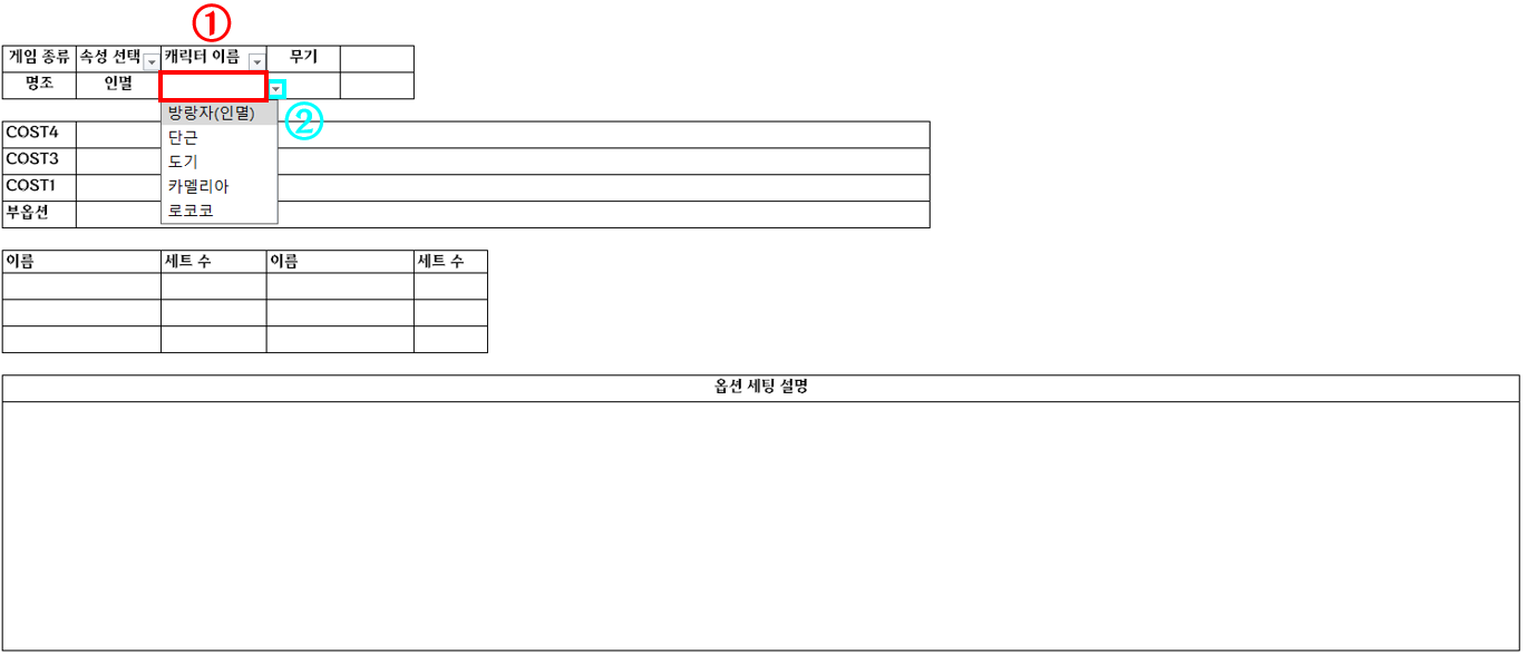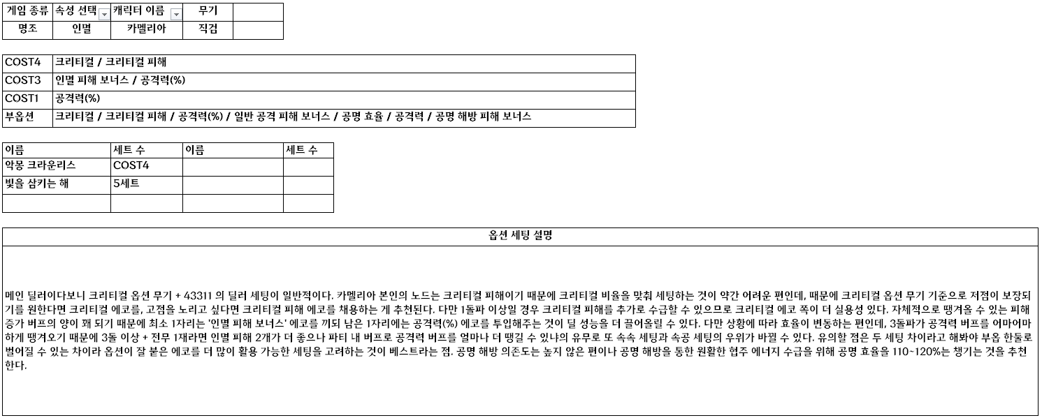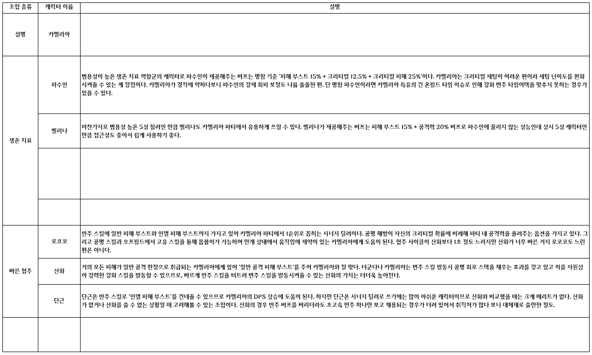 거기에 캐릭터마다 운영 방법이랑 조합도 신경써줘야 해서, 해당 부분을 한 번에 볼 수 있는 엑셀 파일을 만듷었습니다!