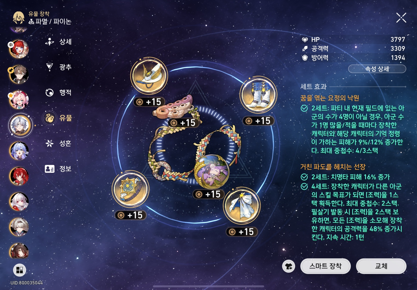 - 히아킨: 명함 / 대체 광추 (기억은 영원한 막을 내리지 않는다 : 속도 증가+아군 가하는 피해 증가) / 9 행적