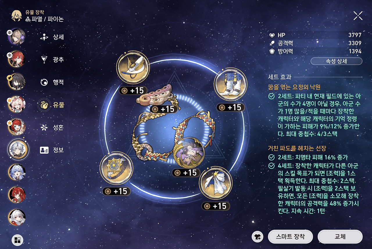 1파티는 파이논이 메인 딜러이기 때문에 전투 스킬 공격 시 추가 확정 피해를 주는 버프를 사용했습니다.
