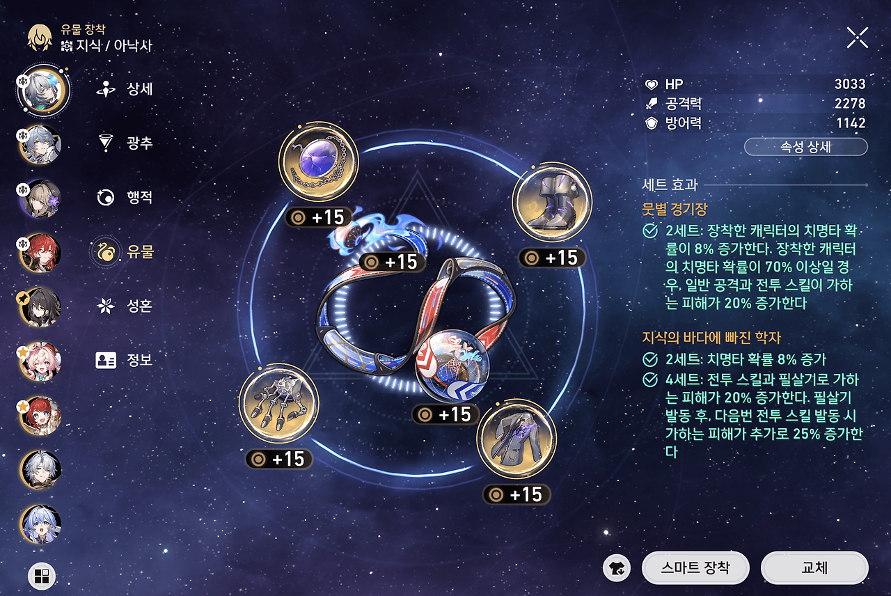 - 아낙사: 명함 / 대체 광추 (우주 대사업: 공격력 증가+약점 개수마다 가하는 피해 증가) / 10행적