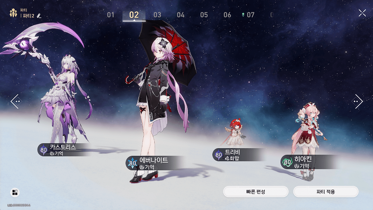 파티 대체로는 에버나이트/더 헤르타/아낙사/카프카+히실렌스 파티 대체 가능합니다!