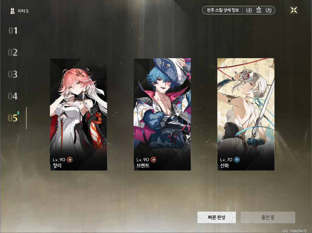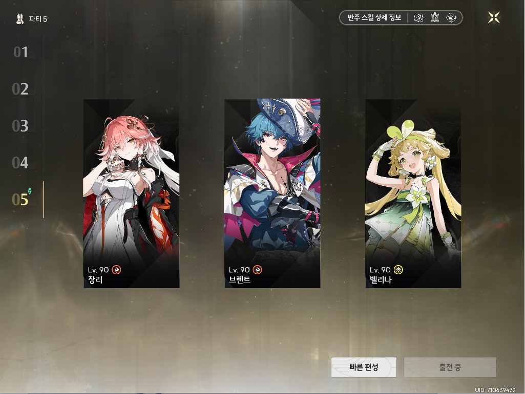 파티의 핵심은 장리로 빠르게 스왑할 수 있냐는 것이기 때문에 벨리나 외에도 빠르게 협주를 진행할 수 있는 캐릭터라면 어떤 거라도 상관 없습니다:)