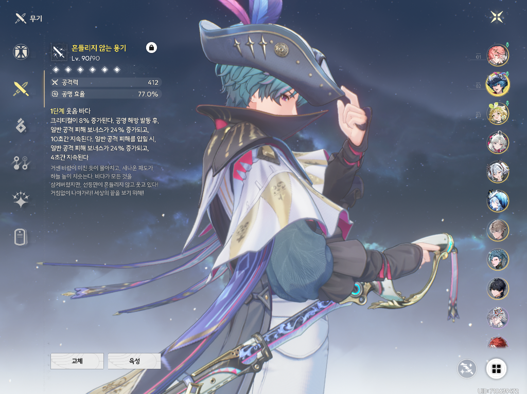 무기는 전용 무기가 공명 효율이 많이 붙어있어서, 웬만하면 전용 무기를 사용하시는 걸 추천 드립니다!!