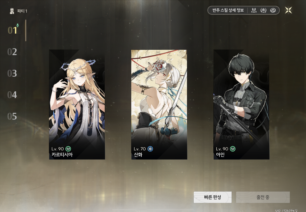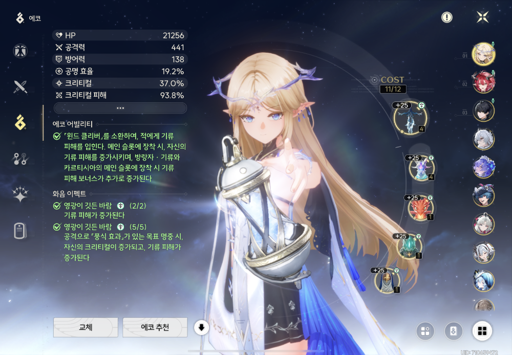 가장 기본 파티가 기류 방랑자, 산화 같이 배급 캐릭터이기 때문에 카르티시아만 잘 키워도 파티에 무리가 없습니다.
