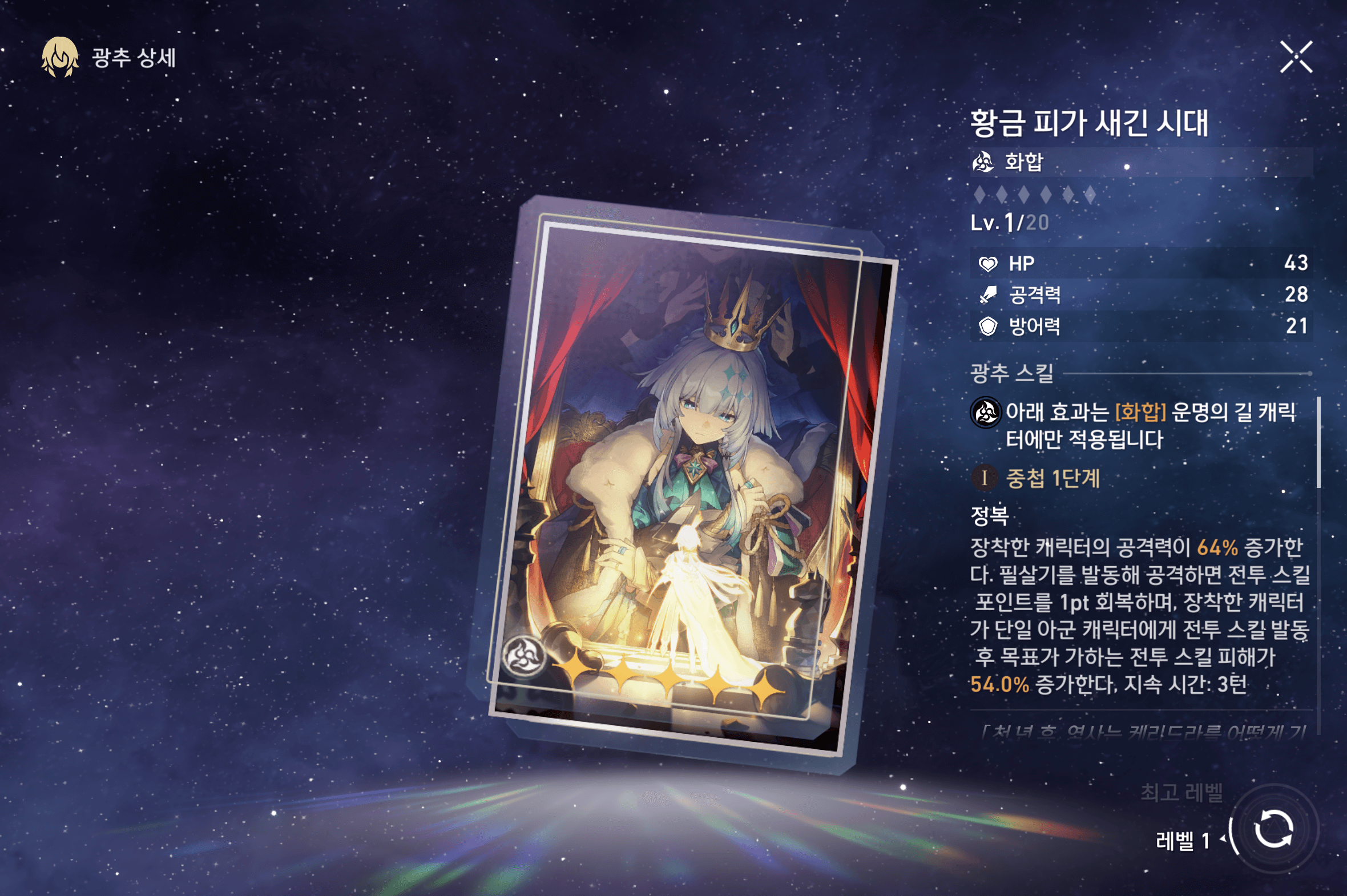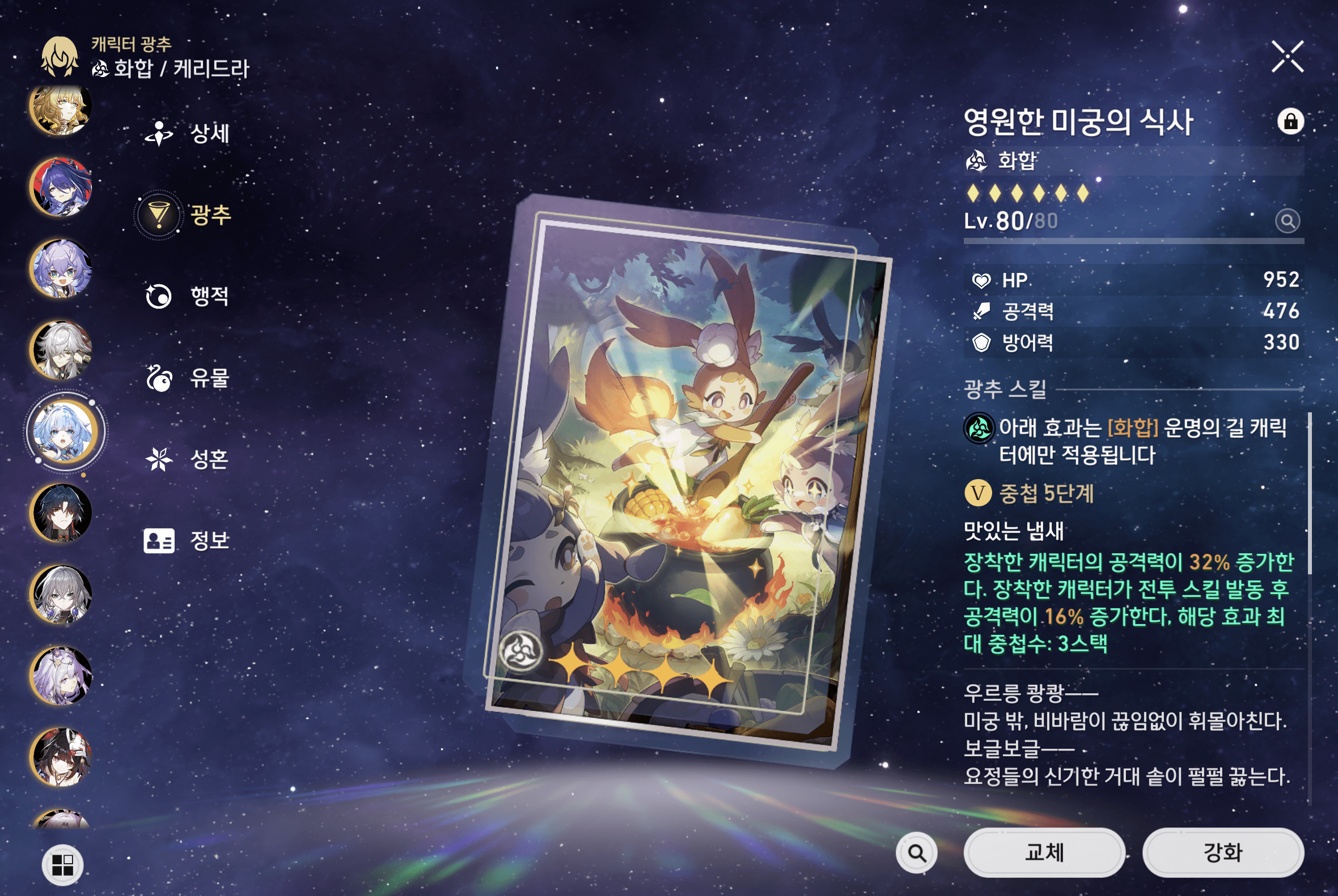 명함+대체 광추로 충분히 효율이 잘 나오는 캐릭터이기 때문에 명함 정도는 가져가시는게 좋을 것 같네요.