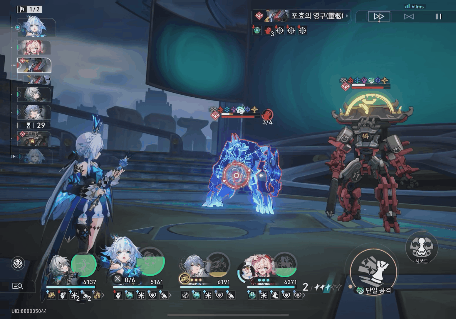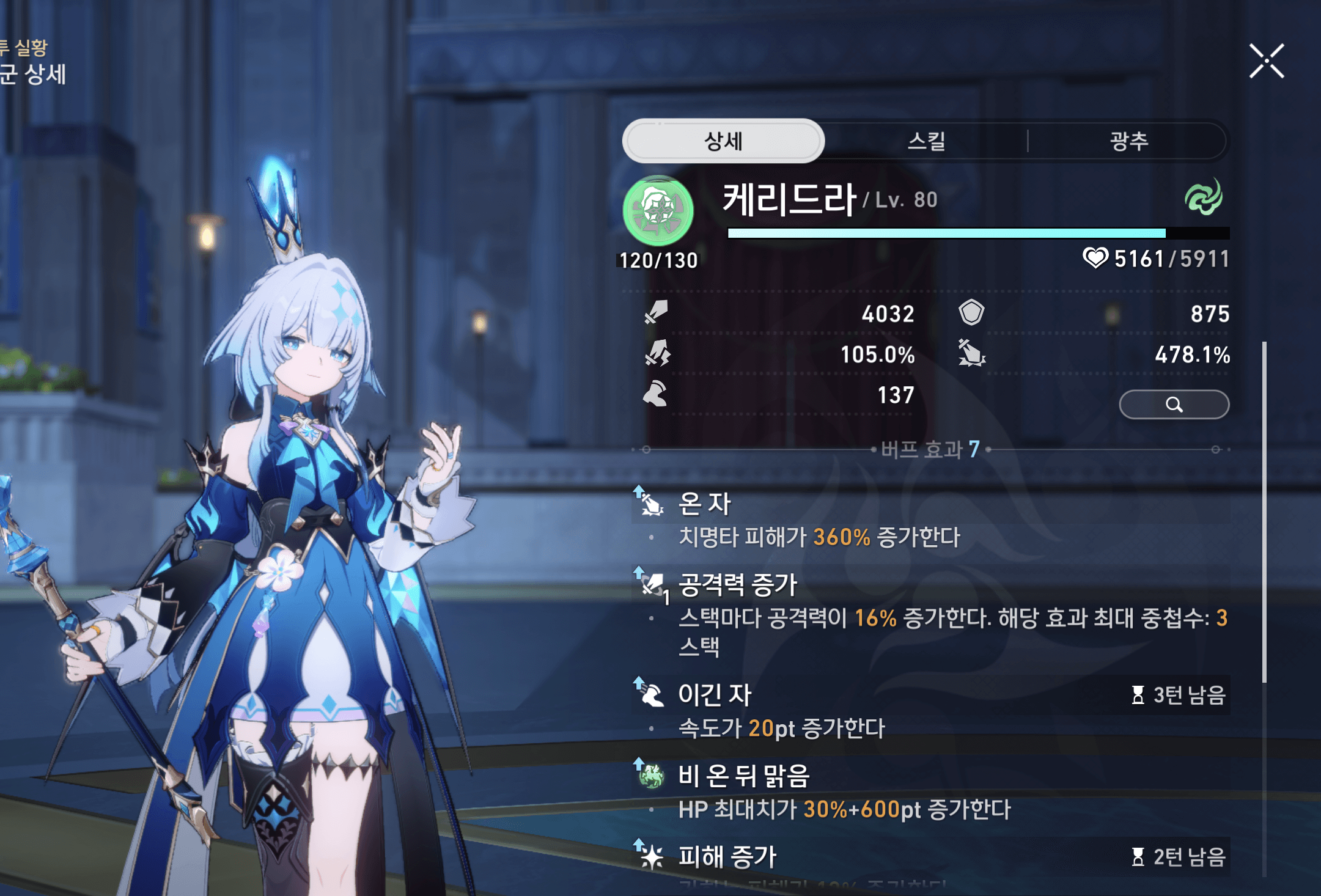 이 때 첫 번째 전투 스킬은 치명타 피해, 속성 저항 관통 버프를 받아 더 강력하게 나갑니다!
