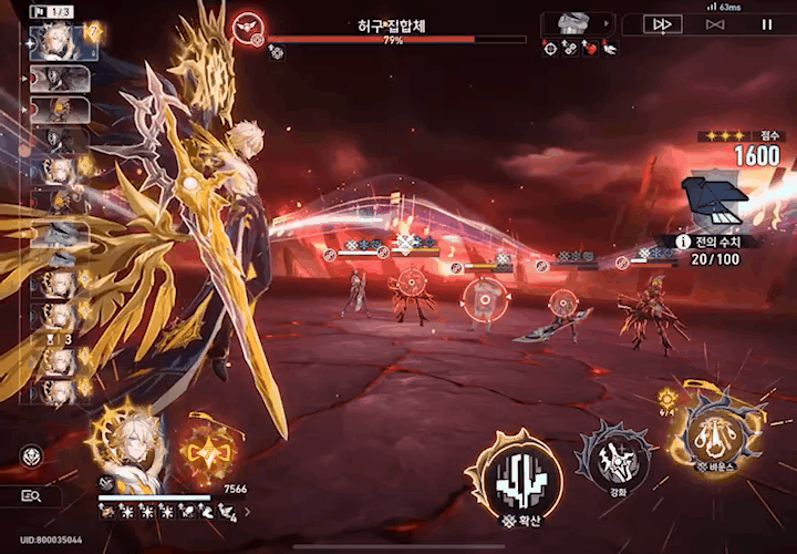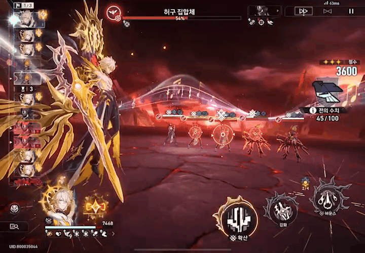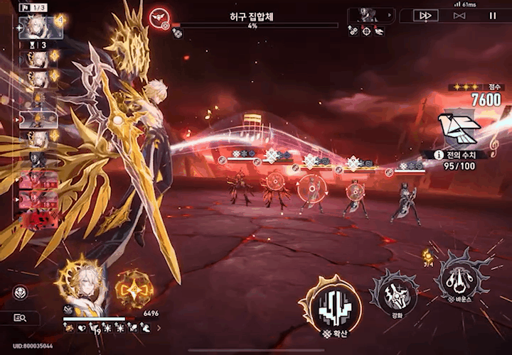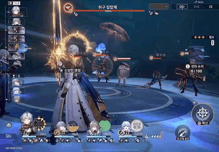 마지막으로 카오스라나의 필살기 급 전투 스킬은 특수 포인트를 소모하여 적 전체에 바운스 피해를 가합니다.