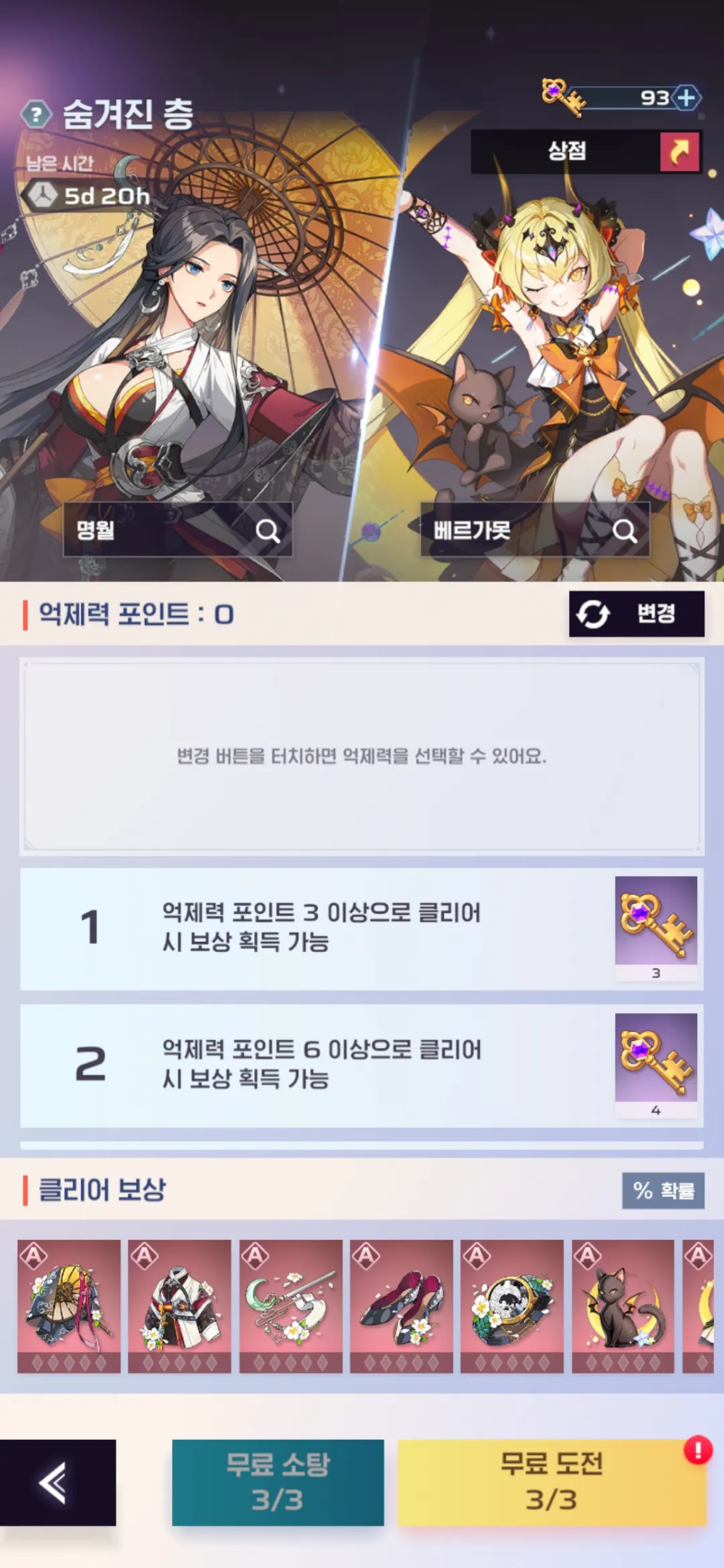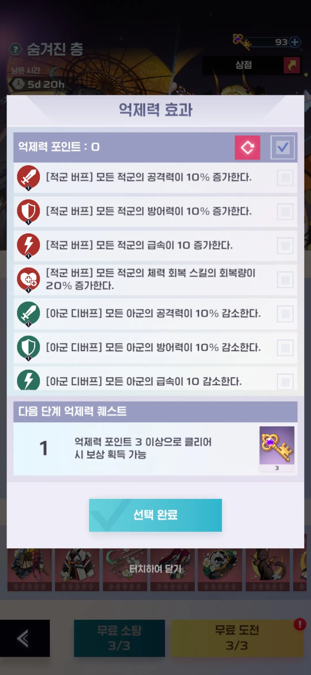 ○ 높은 억제력으로 클리어 해야 입장권과 강화에 필요한 재화를 획득할 수 있음 - 하루에 3번 도전 가능