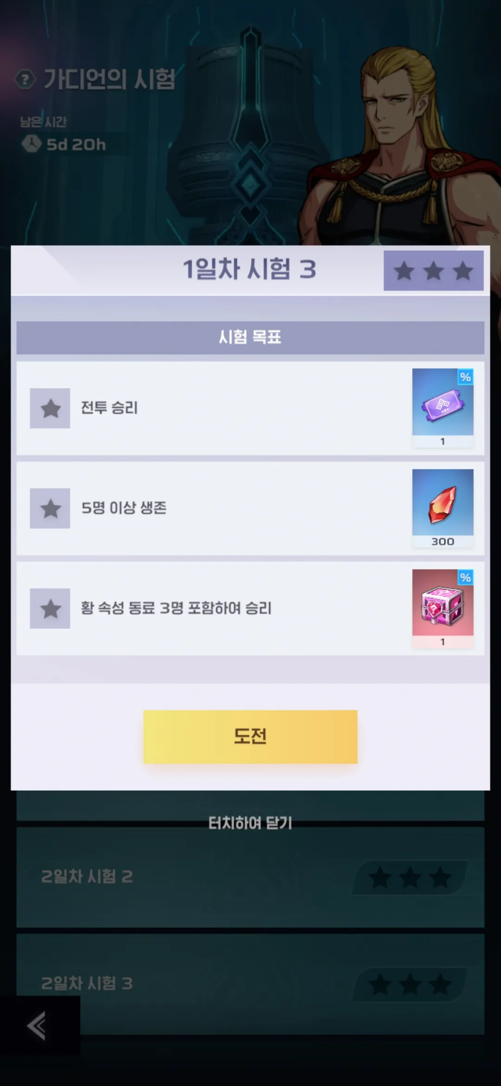 ※ 이후 업데이트를 통해 클리어만 해도 뽑기권을 주는 형식으로 변경 - 세번째 미션은 각 캐릭터의 속성 및 역할을 제한하는 미션이 대부분